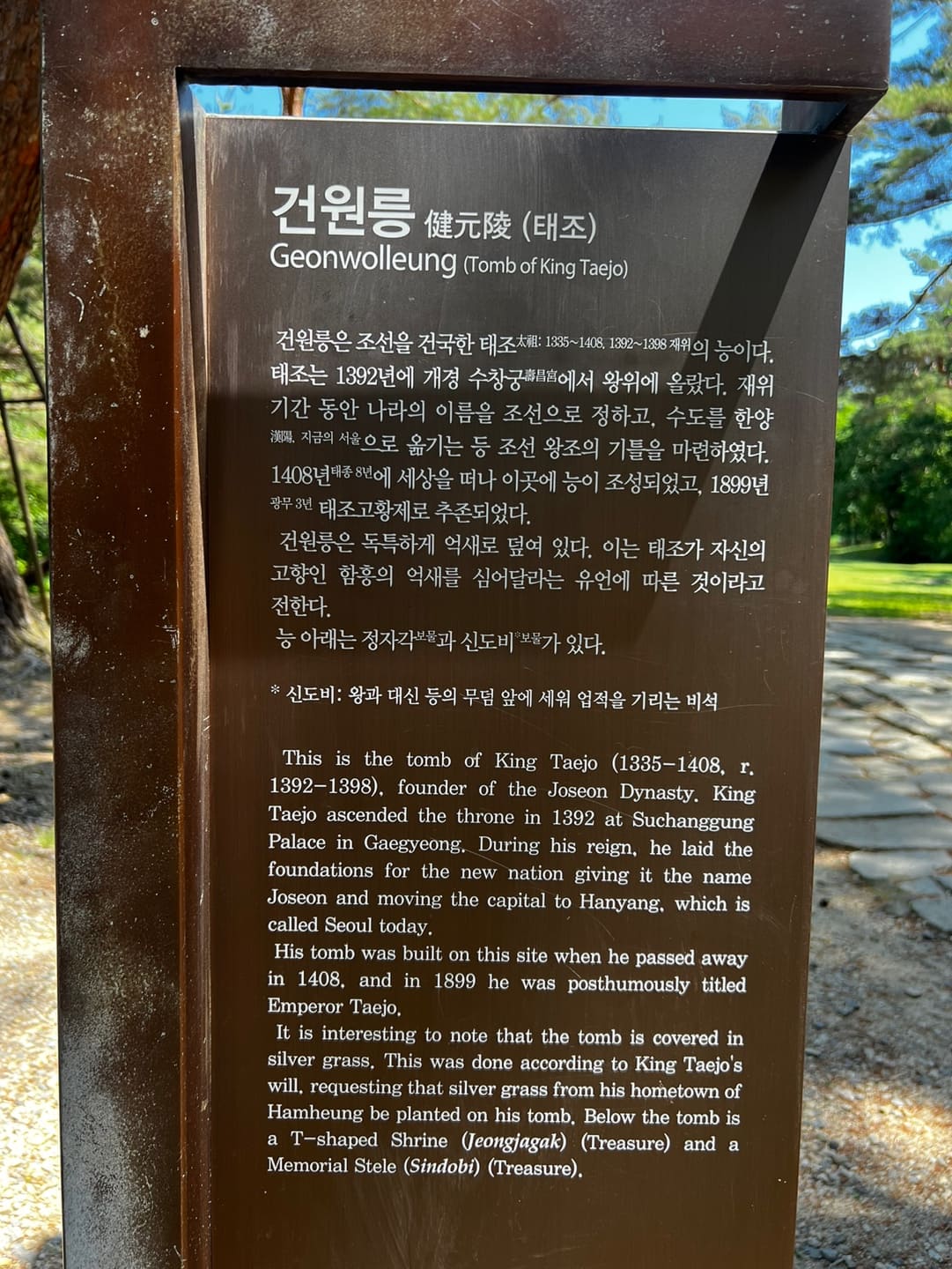 홍살문을 지나 드넓은 들판이 펼쳐질 때, 그 한가운데 자리 잡은 건원릉이 보인다. 고요한 언덕 위에 억새풀이 일렁이고 있었고, 역사적 무게감 속에서도 이상하리만큼 상쾌한 기분이 밀려왔다. 태조의 유언에 따라 고향 함흥의 억새풀이 덮인 이 무덤은, 자연과 함께하는 삶의 철학을 그대로 품고 있었다.