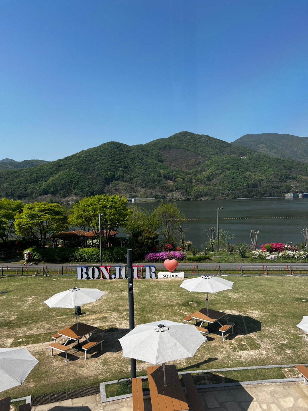 차분한 이 카페의 백미는 역시 밖으로 이어진 잔디 정원이다. ‘BONJOUR’라고 적힌 알파벳 조형물 옆에는 하얀 파라솔과 우드 벤치가 드문드문 놓여 있어, 따스한 햇살 속에서 책 한 권을 펼치거나 간단한 피크닉을 즐기기에 안성맞춤이다. 시선을 옮기면 팔당호 건너편으로 겹겹이 이어지는 산등성이가 연둣빛에서 짙은 초록으로 차오르는 모습을 한눈에 담을 수 있다.