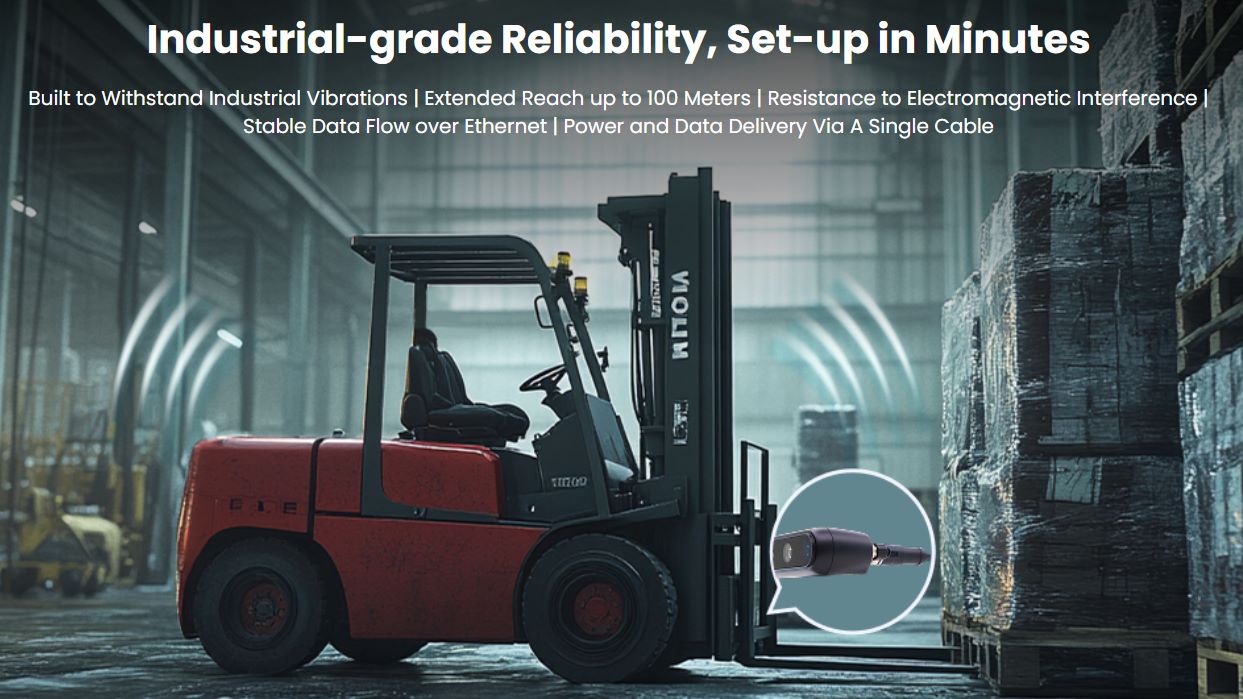 - 케이블 길이 100 m까지 신뢰성 있는 전원·데이터 동시 전송 (PoE)
