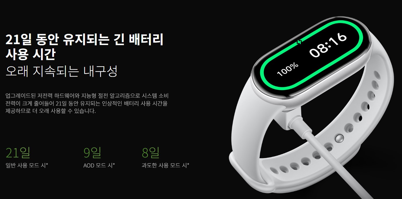 한 번 충전으로 최대 21일까지 사용 가능한 샤오미 스마트 밴드 10의 배터리는 정말 강력합니다. 저는 현재 9일 정도 사용 중인데 아직 절반 정도 배터리가 남아있네요. 자주 충전하기 번거로운 분들에게 큰 장점이 될 수 있어요.