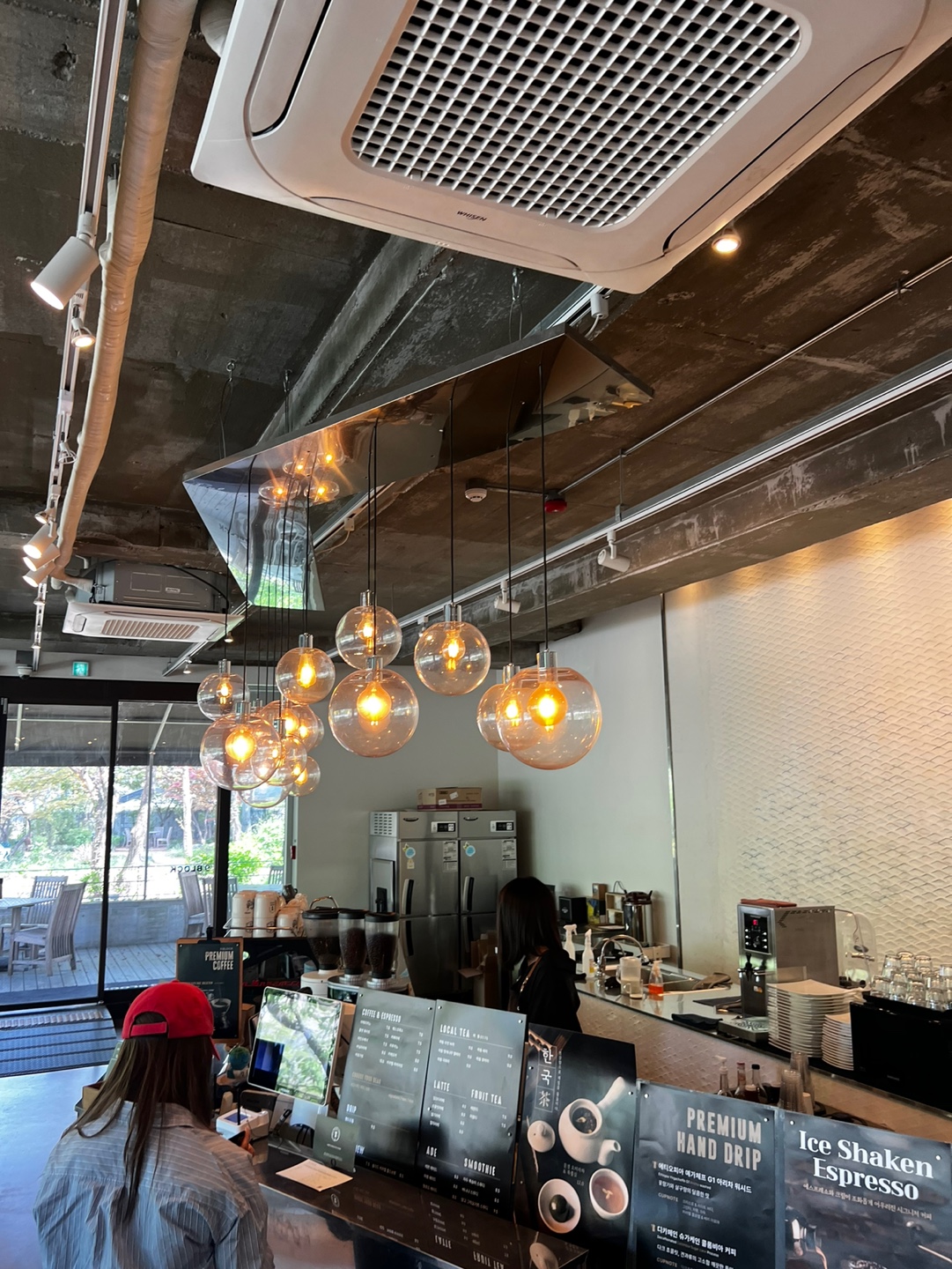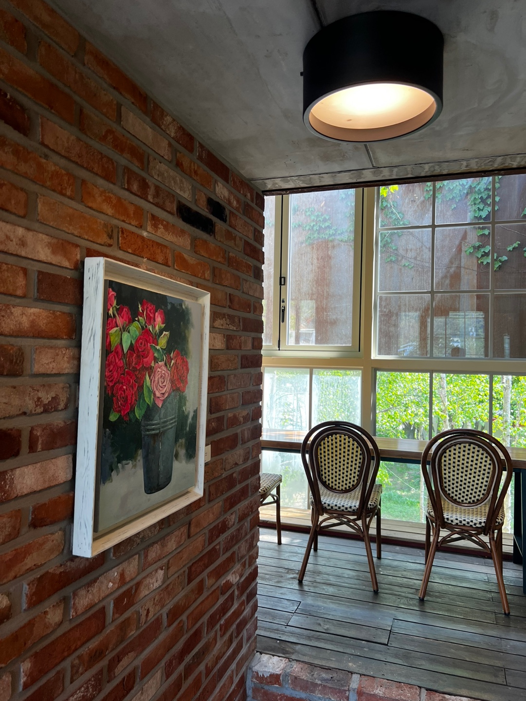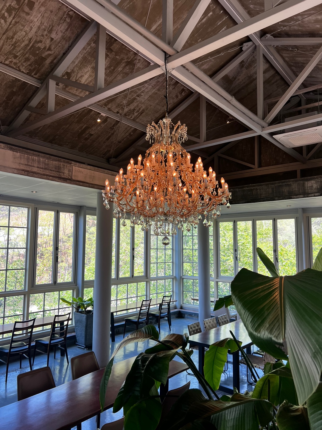 2층으로 올라가면, 거대한 샹들리에가 천장 철골 사이에 우아하게 매달려 있었다. 수십 개의 크리스털이 햇빛을 받아 춤추듯 반사되고, 푸른 잎사귀를 품은 실내 화분들이 반투명의 그림자를 바닥에 드리웠다. 벽돌 벽 한쪽에는 ‘This is our happy place’라는 작은 간판이 걸려 있는데, 그 문구가 이 공간을 향한 내 마음을 대변해 주는 듯했다. 나무 결이 살아 있는 테이블 앞에 앉아 창밖을 바라보면, 녹음이 살짝 번져 물감처럼 번지는 호수빛이 시야에 담긴다.