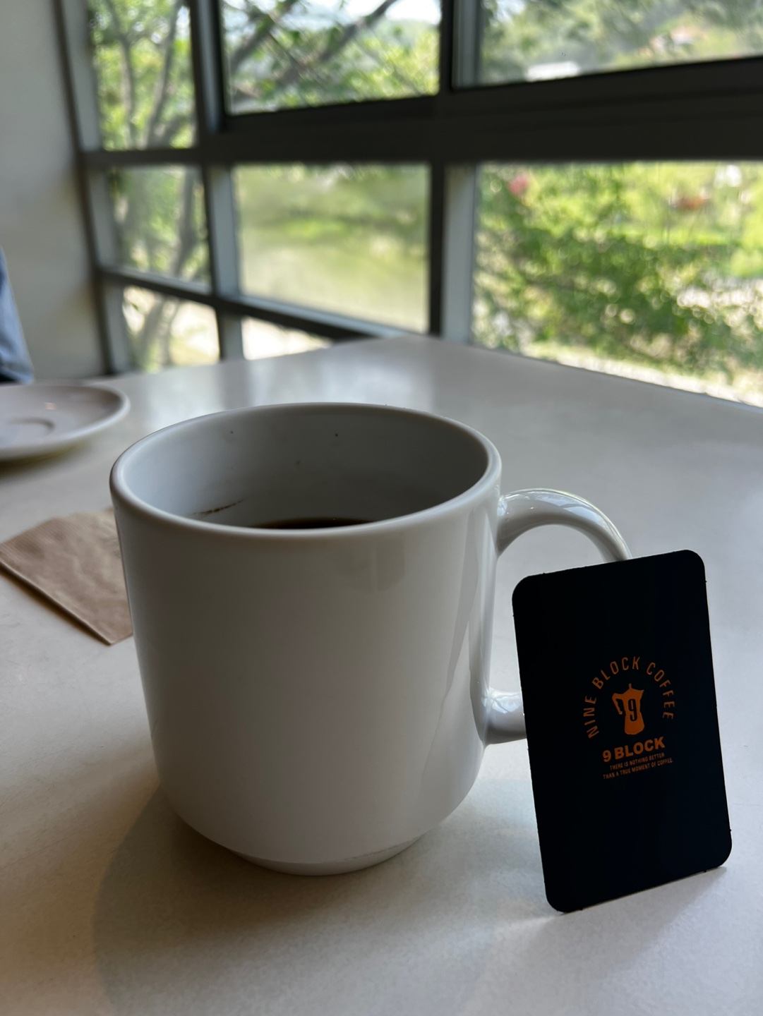 손끝을 따스하게 적시는 머그잔 속 커피 한 모금, 그리고 옆에 살포시 기대어 있는 ‘9 BLOCK COFFEE’ 로고 카드. 그 조용한 조합이 묘하게 든든했다. 이곳에서의 시간은 느리게, 그러나 꽉 채워진 채 흐른다. ‘시간 여행’이란 거창한 표현 대신, 오늘의 나에게는 그저 “조금 더 나를 사랑하는 법”을 가르쳐 준 달콤한 휴식이었다.