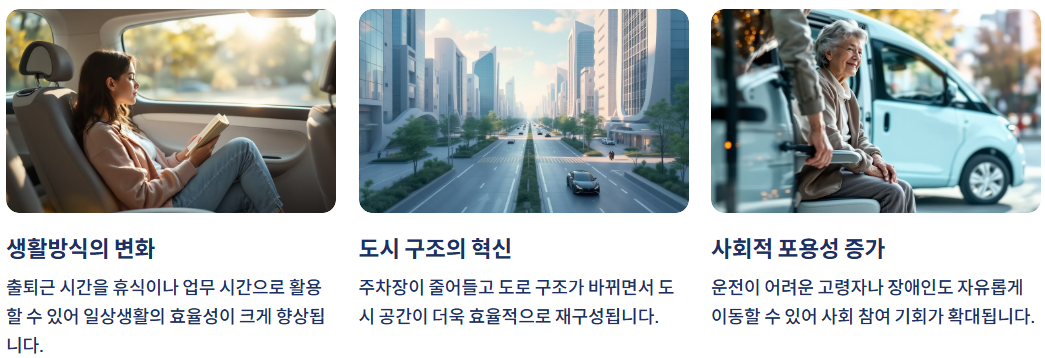 특히 자율주행기술이 상용화되면 다음과 같은 변화가 예상됩니다.