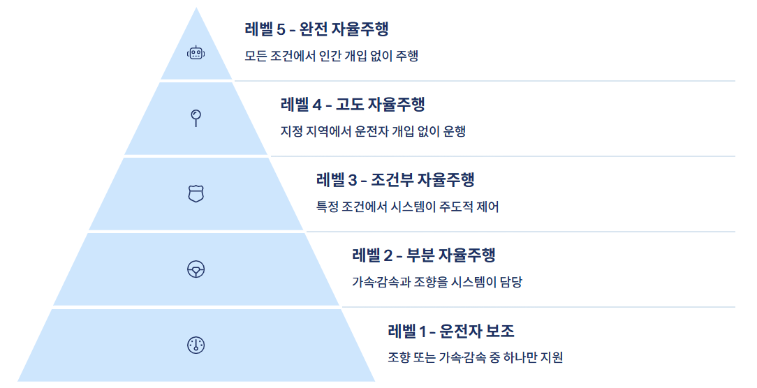자율주행자동차의 수준은 SAE(미국자동차기술자협회) 기준에 따라 총 6단계(레벨 0~5)로 구분됩니다.