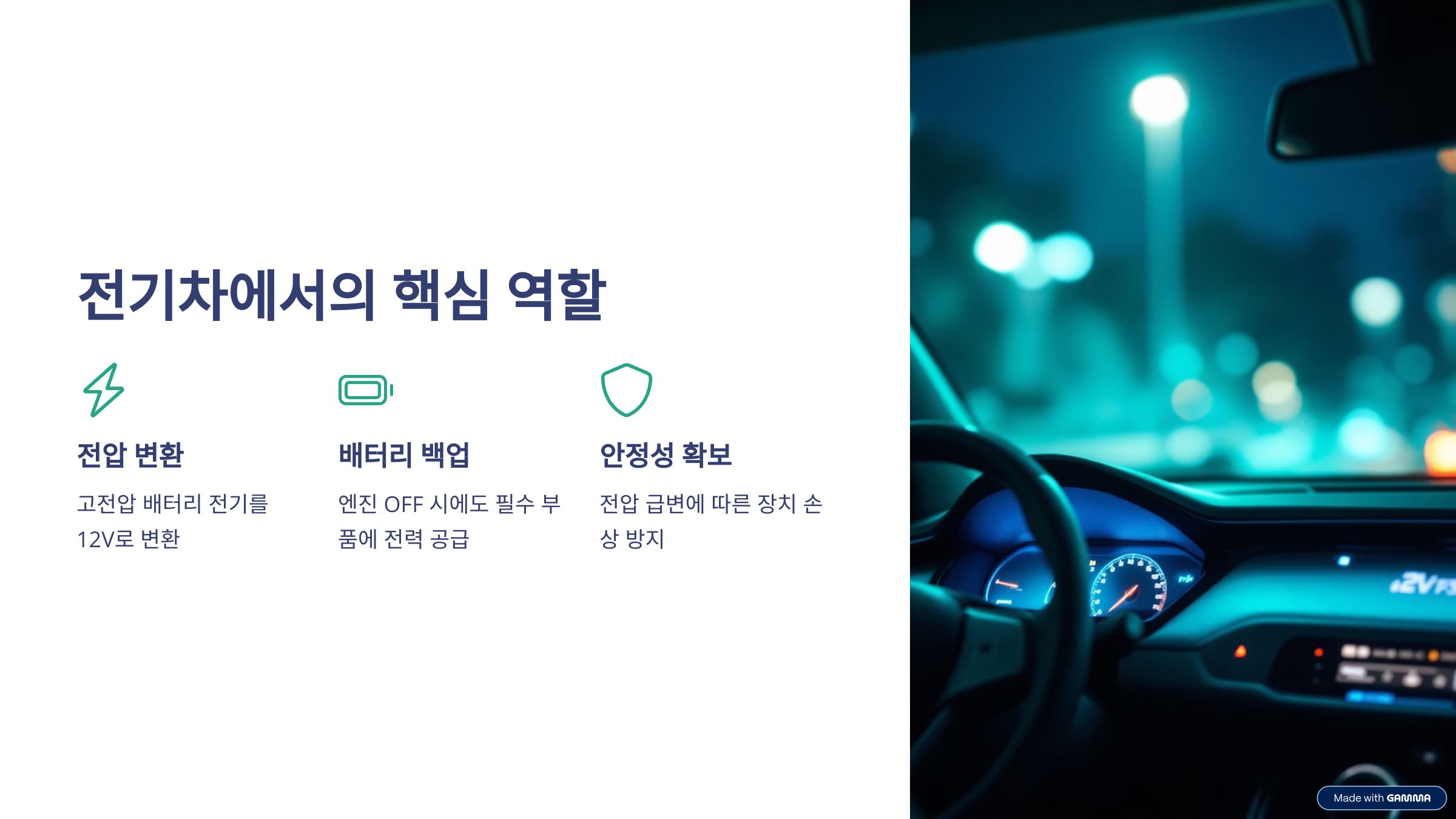 - HV 배터리가 직접 저전압 시스템을 구동할 수 없어 중간 변환 필요