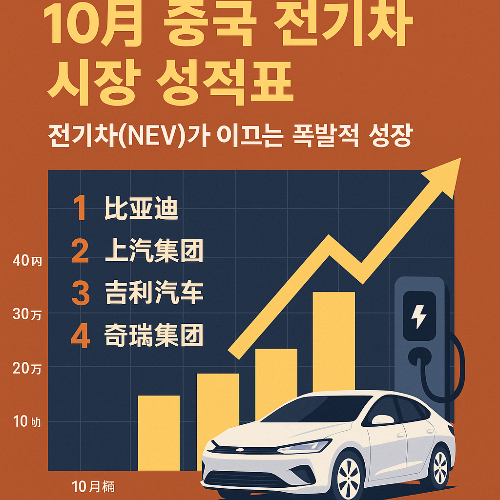2025년 10월 중국 자동차 시장에서 전기차(NEV, 신에너지차량) 가 핵심 엔진으로 자리잡았습니다. 특히 전기차 시장에서 여러 브랜드가 기록을 새로 썼고, 시장 전체의 구조 변화도 선명해졌습니다. 본 포스팅에서는 10월 전기차 시장의 전체 흐름, 주요 브랜드 성과, 그리고 이를 통해 우리가 주목해야 할 점을 함께 살펴보겠습니다.