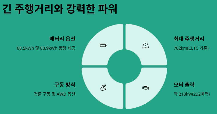 모터 출력은 약 218kW(292마력) 수준으로, 전륜구동과 사륜구동(AWD) 두 가지 트림으로 제공될 예정입니다. 급속 충전도 지원하며, 배터리 공급은 CATL 등 중국 대표 배터리 업체들이 담당합니다.