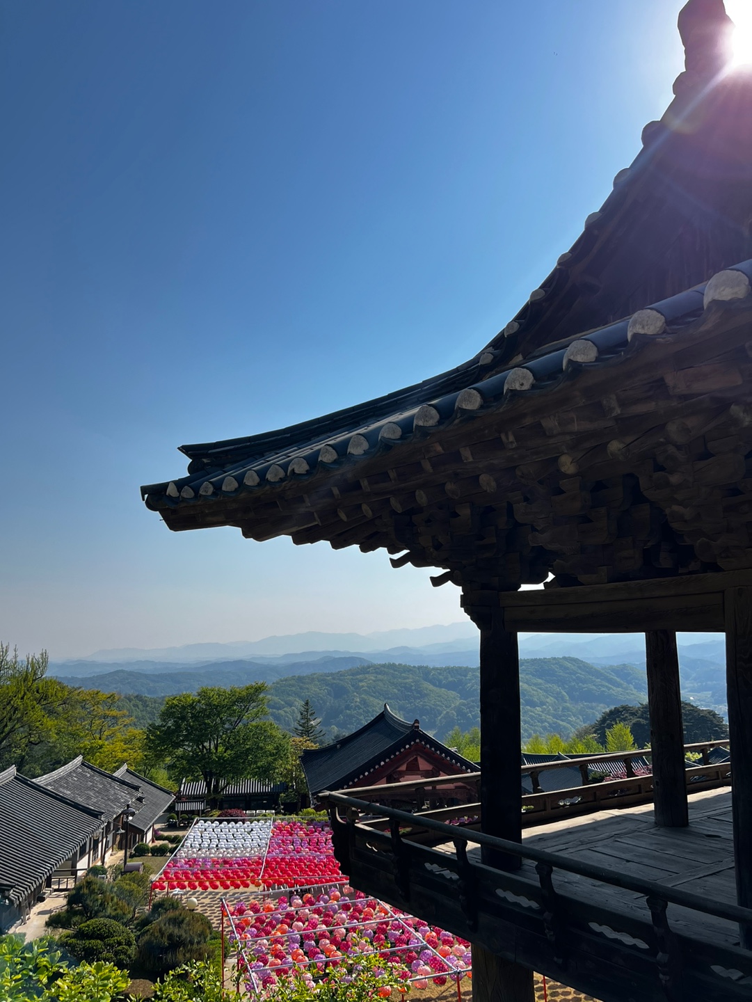 전각 뒤편으로 살짝 걸음을 옮기면, 탁 트인 전망대가 나타나요. 고즈넉한 기와지붕들 사이로 멀리 소백산맥 능선이 겹겹이 펼쳐지는데, 층층이 흐르는 청록의 파도 위로 부드러운 오후 햇살이 내려앉아 한 폭의 수채화를 선사했답니다.