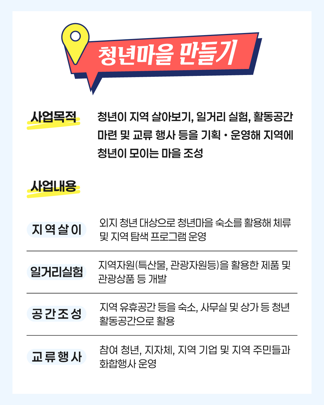 청년마을은 청년이 지역에 머물며 살아보고, 일거리도 실험하고, 함께 어울릴 수 있는 공간을 만드는 프로젝트예요. 지역 유휴 공간을 청년 숙소나 사무실, 문화 공간으로 바꾸기도 하고, 지역 자원을 활용한 새로운 일거리도 만들어내죠.
