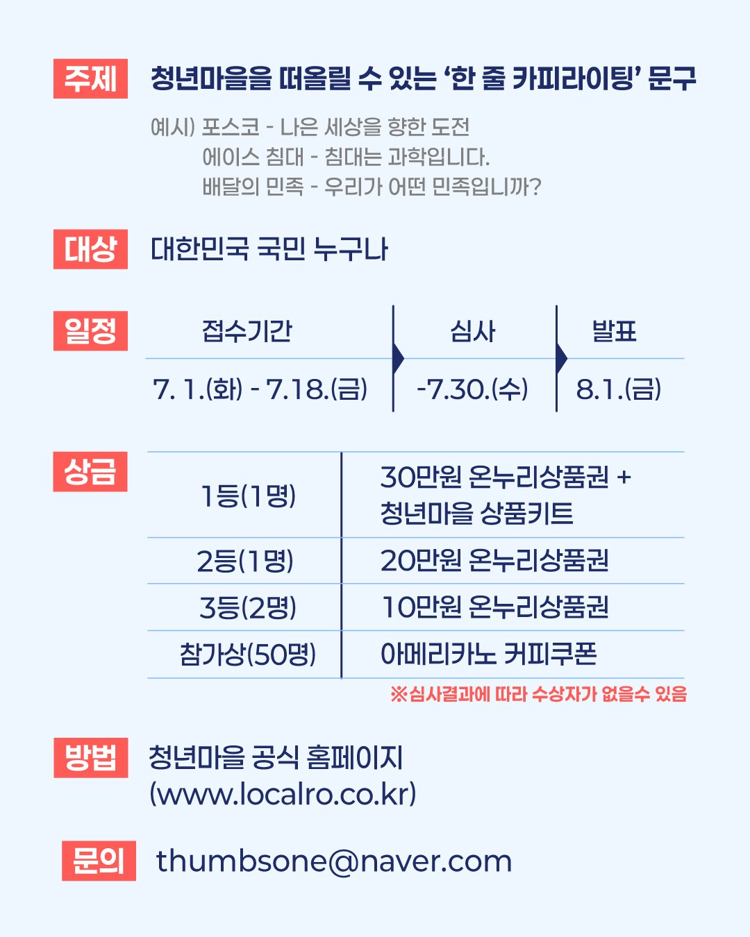 - 1등(1명): 온누리상품권 30만원 + 청년마을 키트