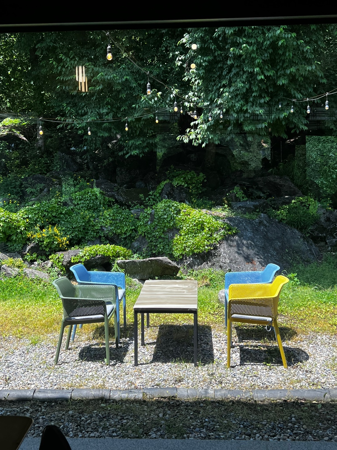 형형색색의 의자가 놓인 작은 테이블에서 불어오는 바람을 마주하며,