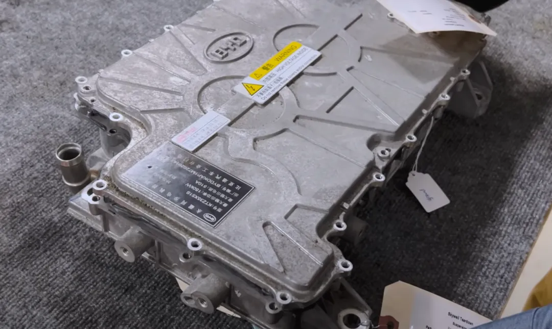 BYD전기차의 인버터는 독립적인 주조 알루미늄 하우징을 사용하여 모터 구동 장치와 분리되어 있습니다. 이는 전통적인 구조적 솔루션으로, 최신 구동 시스템에서는 비용과 무게를 줄이기 위해 인버터를 모터 하우징에 통합하는 경우가 많습니다.
