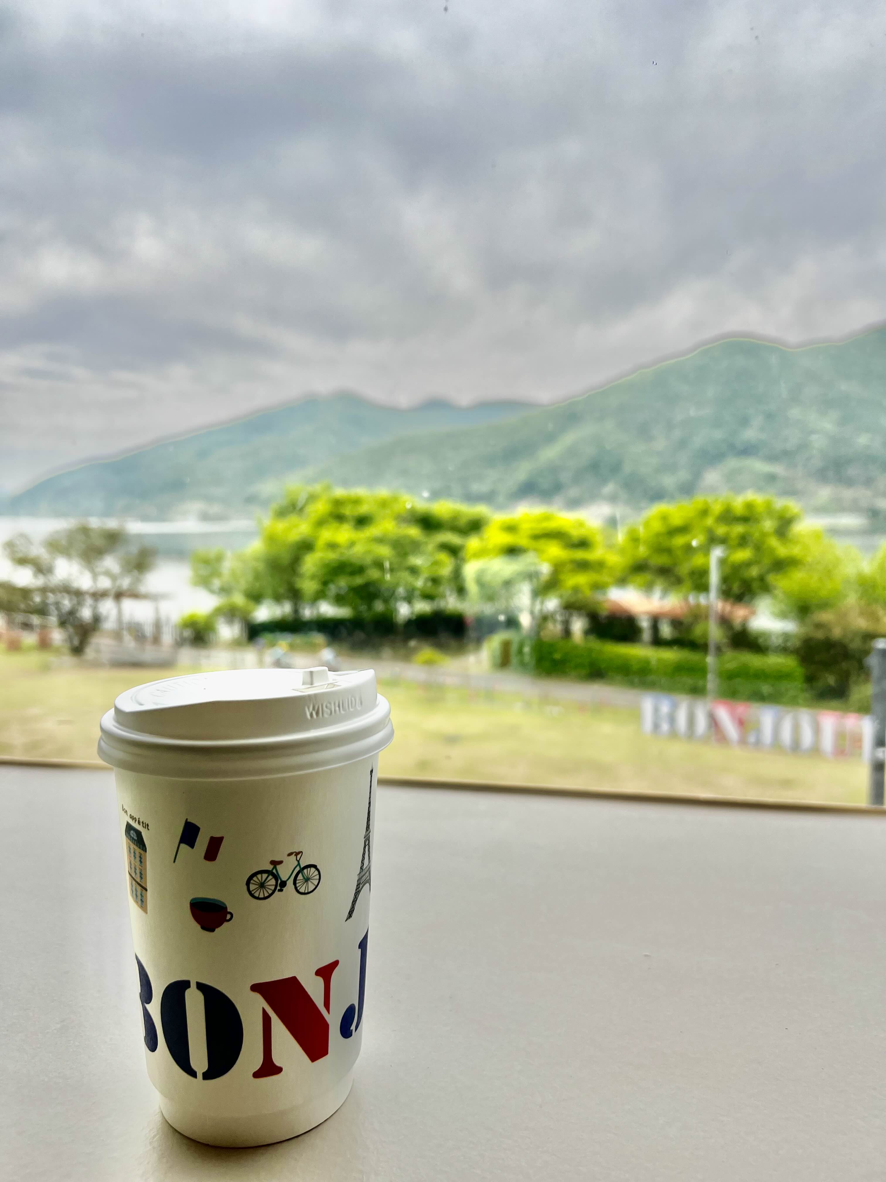 창 너머로는 잔디밭과 강, 그리고 멀리 보이는 ‘봉주르’ 조형물이 배경처럼 펼쳐진다.