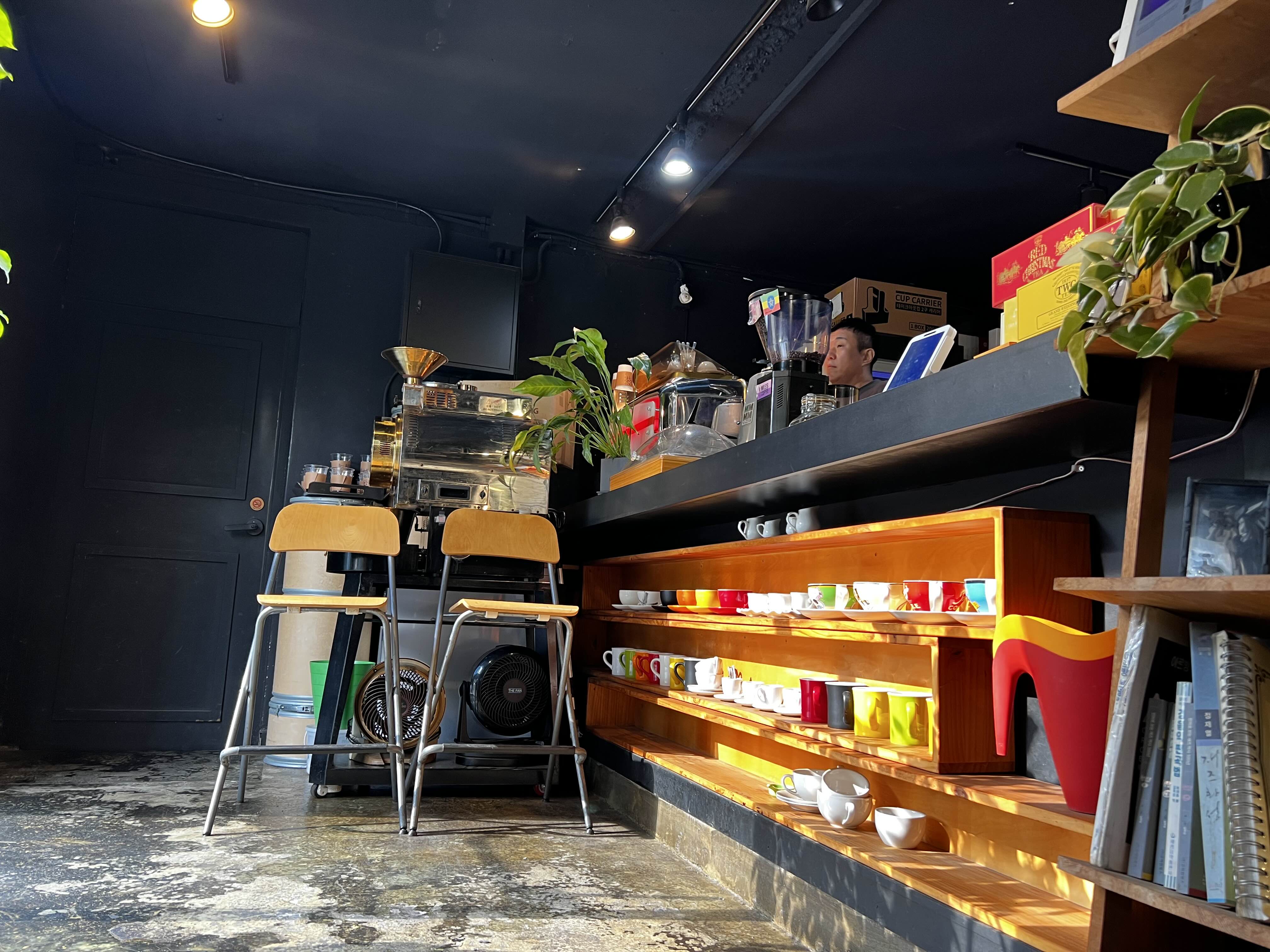 바 테이블 하단에는 색색의 머그컵이 가지런히 진열되어 있어, 블랙 톤 인테리어에 포인트를 주고 있습니다. 커피 머신과 그라인더, 각종 원두병이 정리되어 있는 모습에서 사장님의 커피에 대한 애정이 느껴집니다. 특히, TWG 티 제품과 다양한 티 포트가 준비되어 있어 커피뿐 아니라 차를 즐기기에도 좋은 곳입니다.