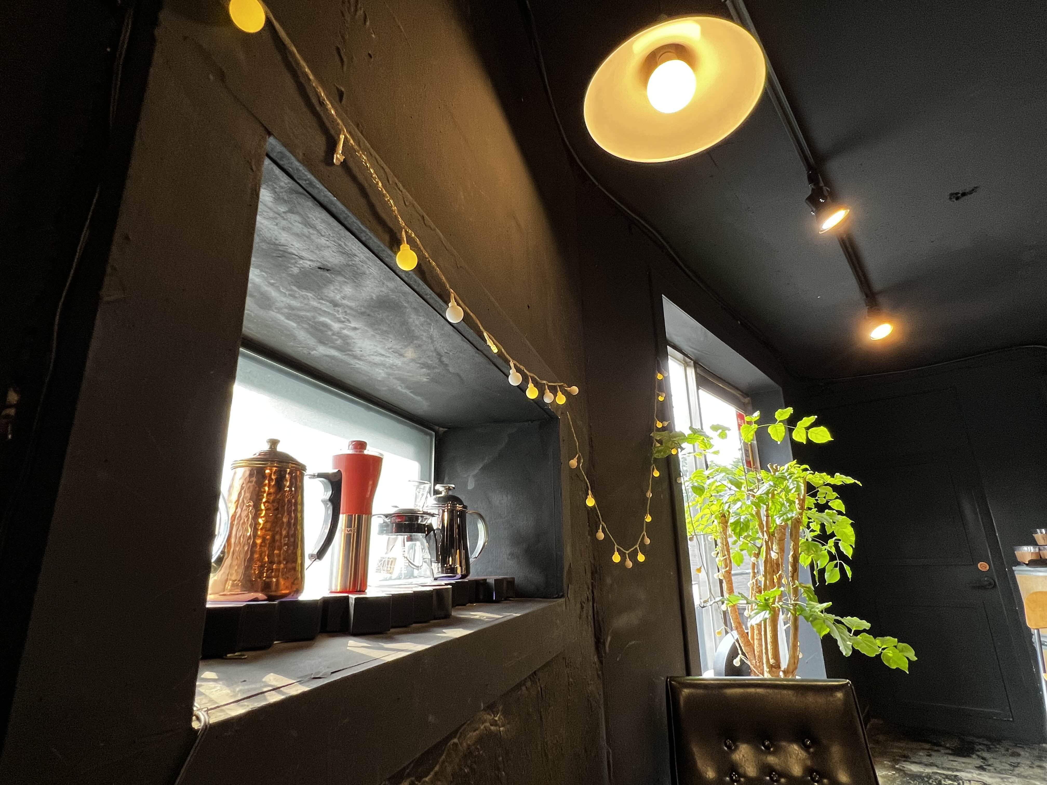 창문 옆에는 구리색과 유리 소재의 커피 서버와 포트가 전시되어 있고, 벽을 따라 노란 전구가 줄지어 있어 밤이 되면 더욱 아늑한 분위기를 만들어줄 것 같습니다.