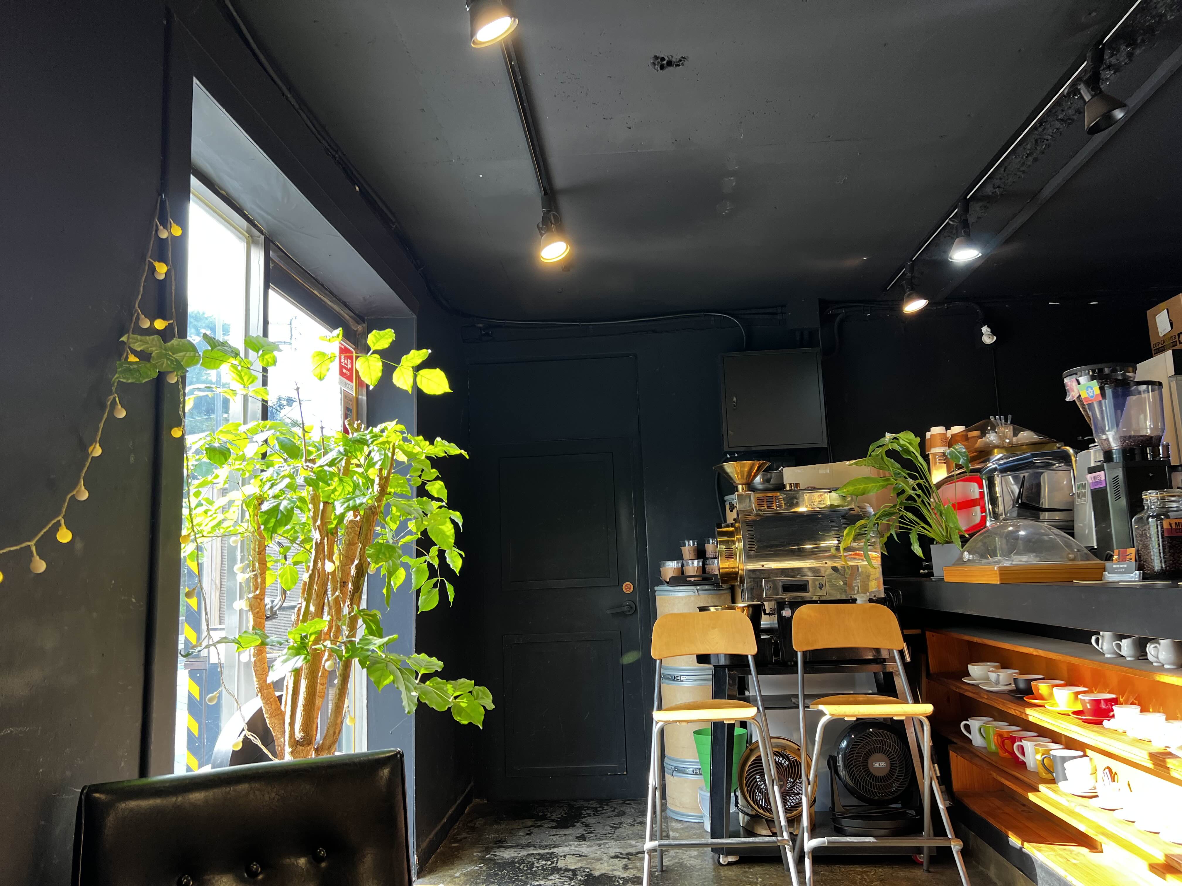 문을 열고 들어서면, 전체적으로 블랙 컬러로 꾸며진 공간이 맞이합니다. 벽과 천장은 깊은 색감으로 안정감을 주고, 창문 틈으로 들어오는 자연광이 테이블과 바를 은은하게 비춥니다. 창가에는 키가 큰 녹색 식물이 자리해 어두운 톤의 공간에 생기를 더합니다.